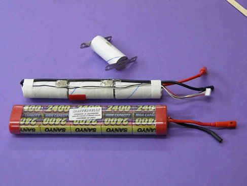 Unten sehen Sie einen unserer Versuchspacks 3S als Stange neben einem Sanyo NiCd 2400mAh inline mit 10 Zellen. Der Gewichtsvorteil beläuft sich auf ca. 350 g. Das sind bei einem Modell mit 1600 g Masse gute 20 Prozent; denn das Modell wiegt mit den Li-Ion Zellen nur noch 1250 g.